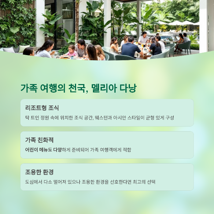 | 멜리아 다낭 | 가족 맞춤형 메뉴 구성 | 외곽 조용한 휴양형 위치 | 상급 |