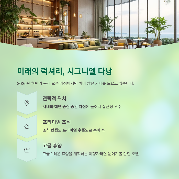 | 시그니엘 다낭 | 프리미엄 조식 예정 | 해변과 중심지 중간 | 프리미엄 예상 |