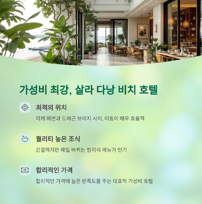| 살라 다낭 | 현지식 위주, 퀄리티 우수 | 해변과 시내 중간 | 중급 |