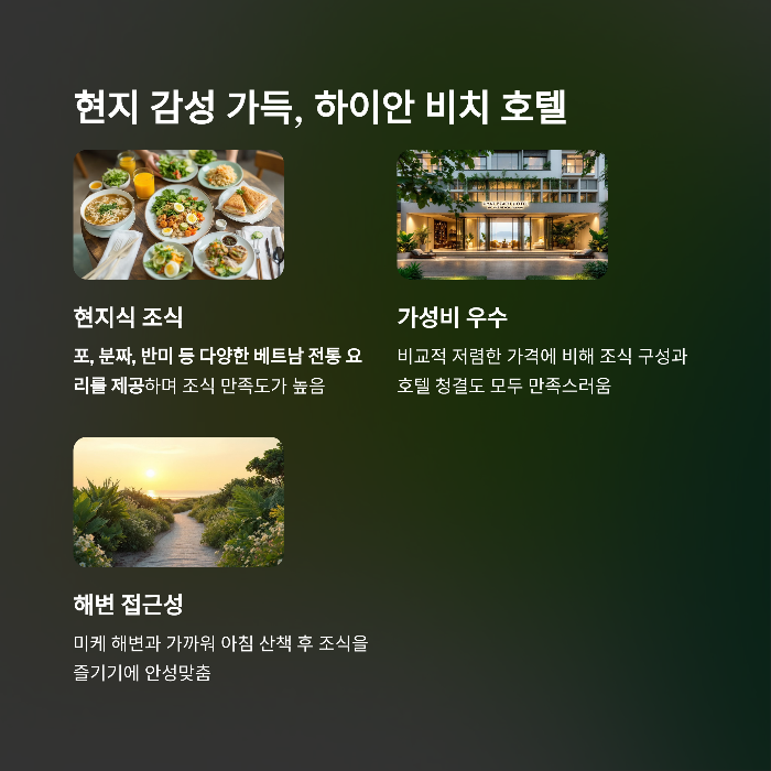 | 하이안 호텔 | 현지식 위주, 저렴한 가격 | 미케비치 도보거리 | 중저가 |