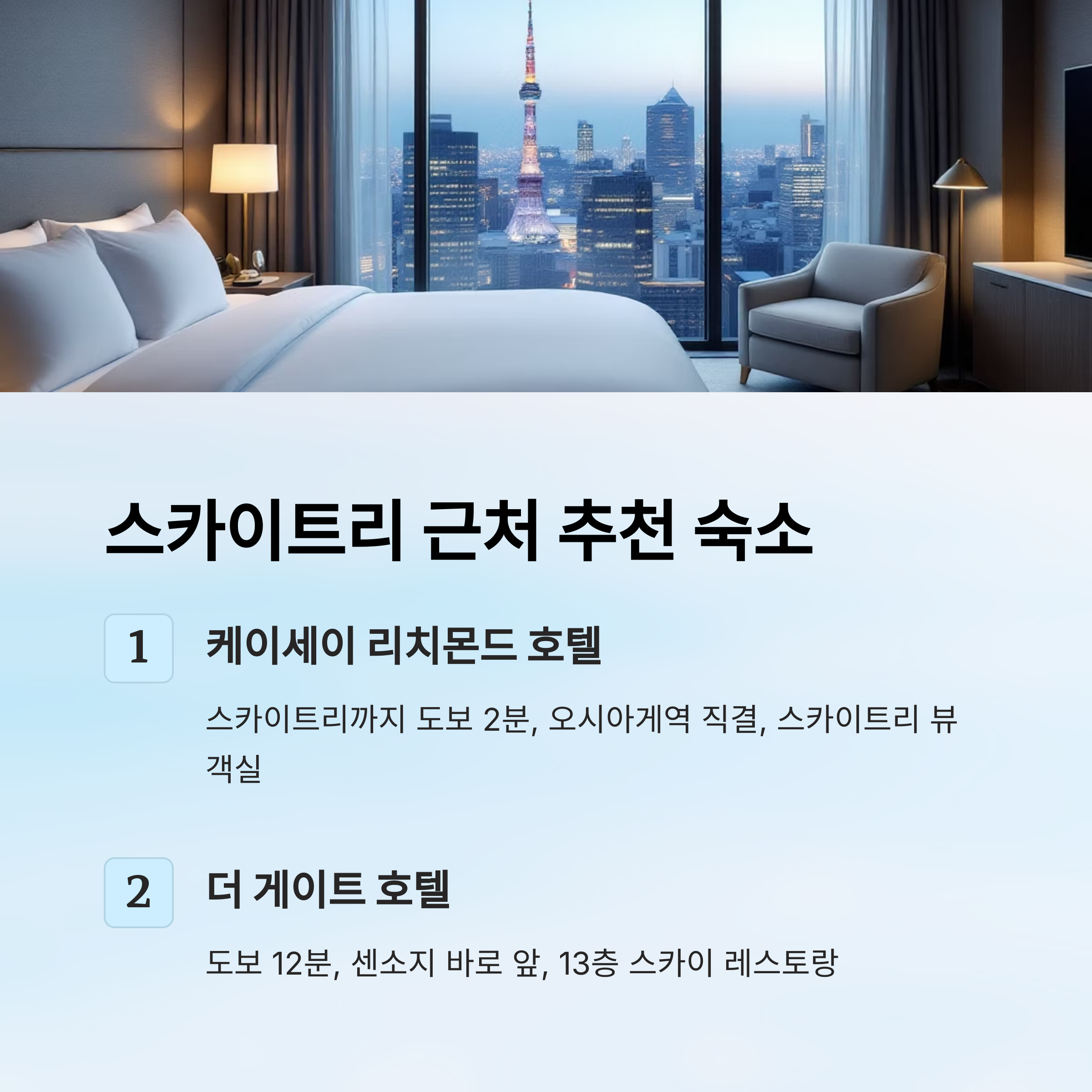 - 추천 이유: 오시아게역 직결, 스카이트리 뷰 객실, 조식 맛있음