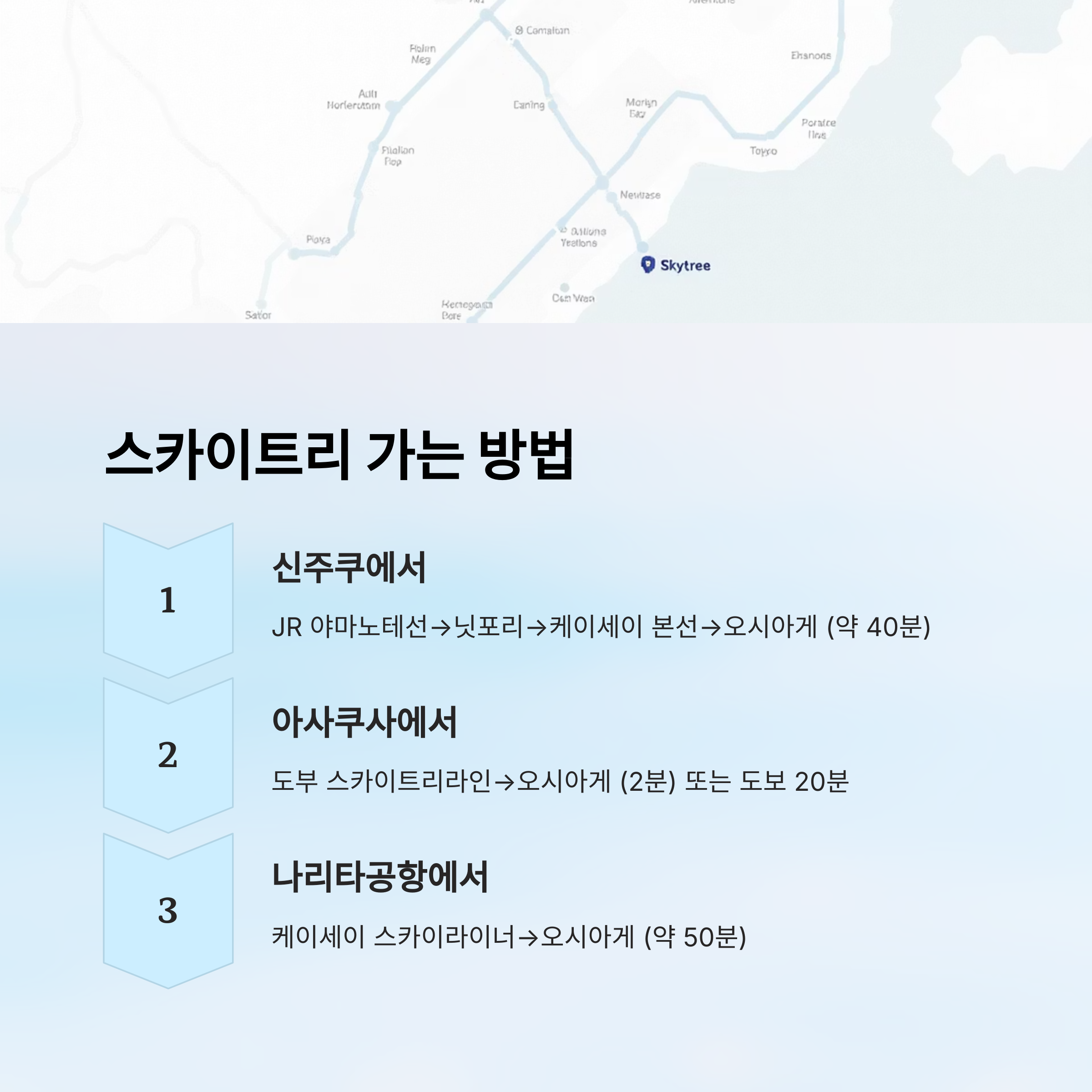 - 또는: 나리타 익스프레스 → 니혼바시 → 아사쿠사선 → 오시아게 (약 1시간 10분)