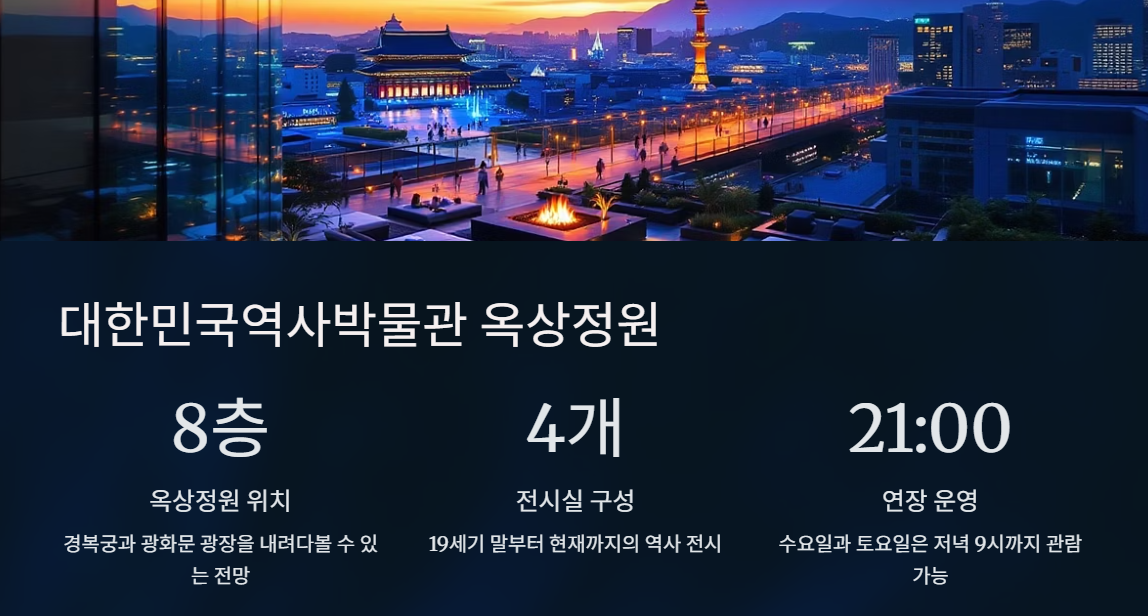 - 추가 팁: 옥상정원은 날씨에 따라 이용이 제한될 수 있으니, 방문 전 대한민국역사박물관 웹사이트에서 확인하세요.