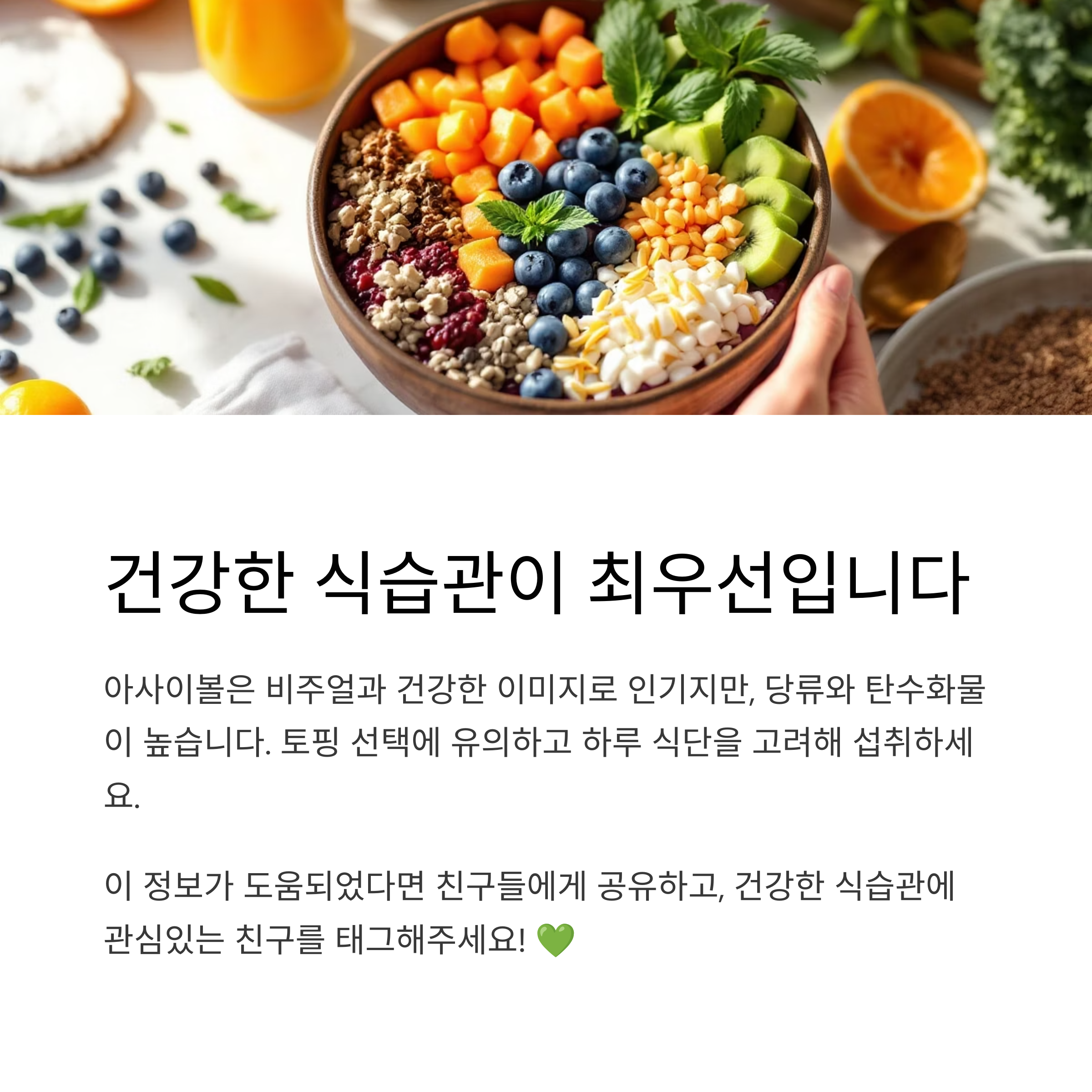 요아정 아사이볼은 비주얼과 건강한 이미지로 인기를 얻고 있지만, 실제로는 당류와 탄수화물이 높은 편입니다. 다이어트 중인 분들이나 혈당 조절이 필요한 분들은 토핑 선택에 유의하고, 하루 식단 전체를 고려해 섭취하는 것이 중요합니다. 균형 잡힌 식단 속에서 아사이볼을 똑똑하게 활용해 보세요.
