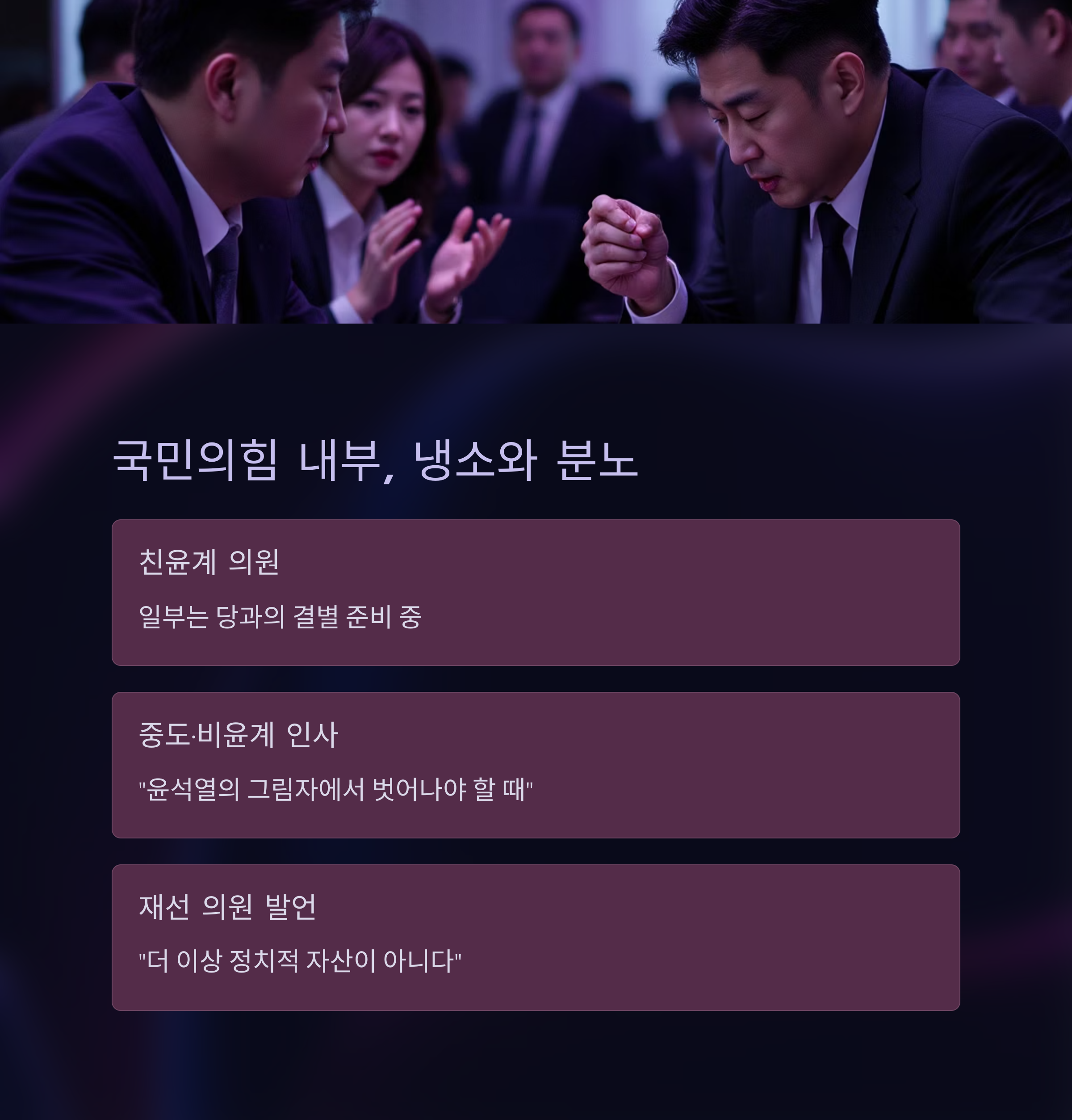 다수 중도·비윤계 인사들은 "이제 당이 윤석열의 그림자에서 벗어나야 할 때"라고 말합니다.