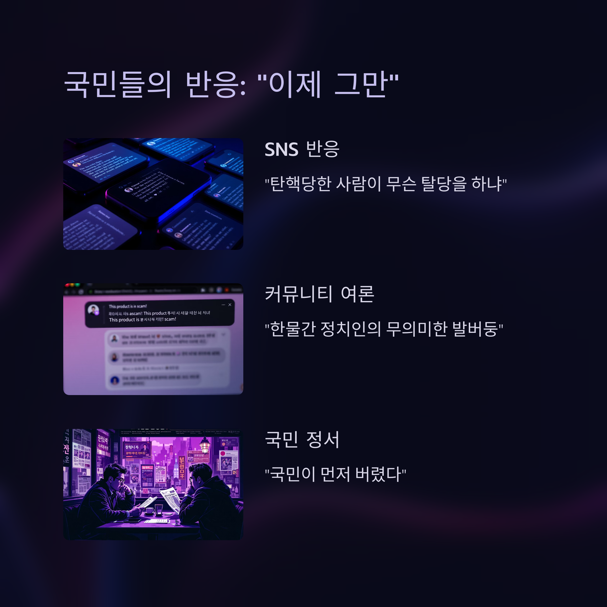 와 같은 반응이 주류를 이루며, 완전한 정치적 퇴장을 요구하는 여론이 거세지고 있습니다.