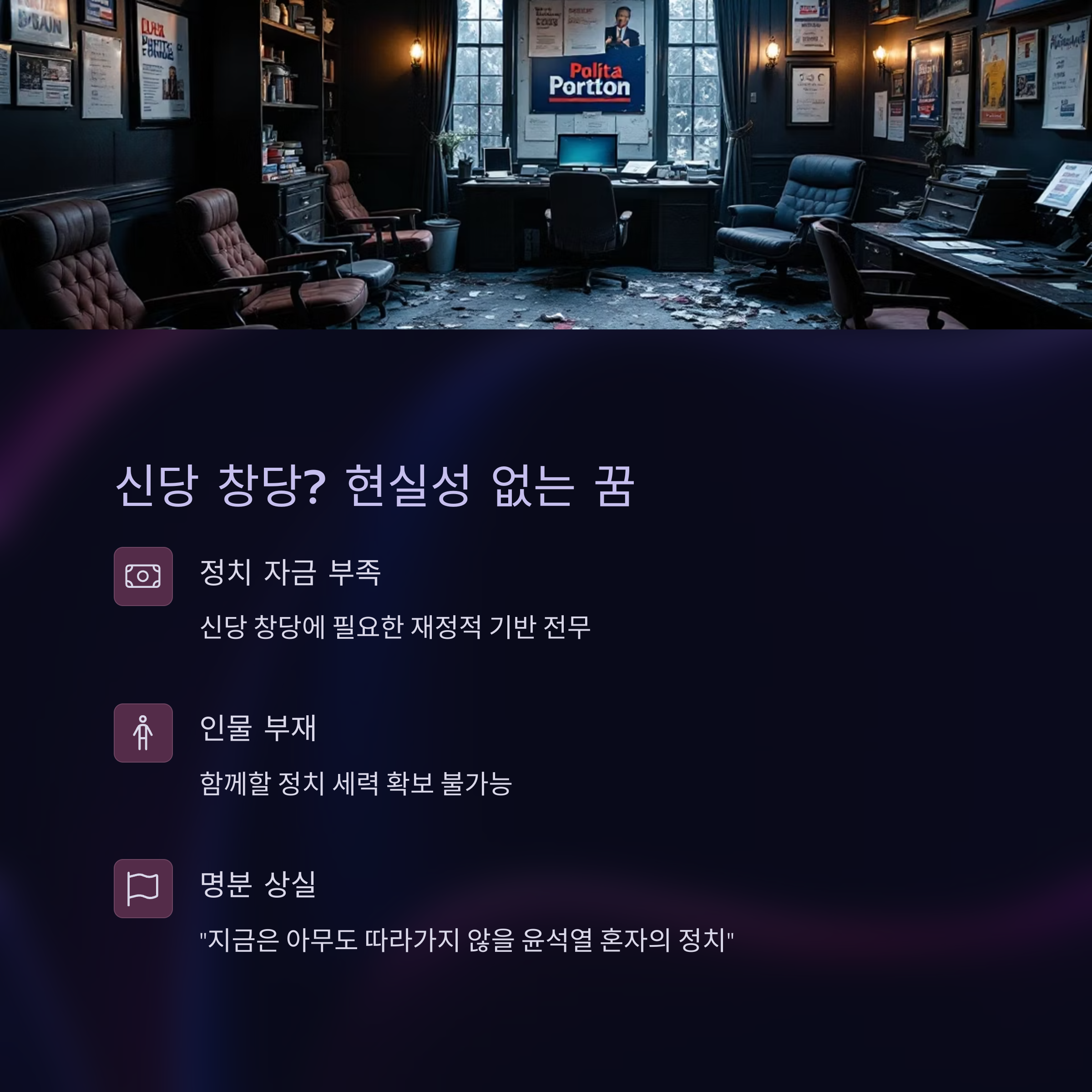 이를 뒷받침할 정치 세력이 거의 전무하다는 분석이 지배적입니다.