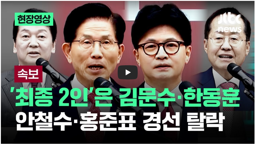 국민의힘은 4월 29일 2차 경선 결과를 발표하며 김문수와 한동훈 후보가 3차 경선(결선)에 진출했다고 밝혔습니다. 안철수와 홍준표 후보는 탈락했으며, 당원 투표(50%)와 국민 여론조사(50%)를 합산한 결과 과반 득표자가 없어 결선이 치러지게 되었습니다.