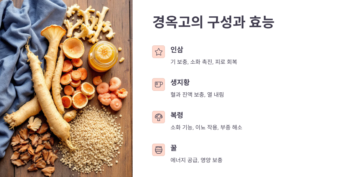 경옥고는 인삼, 복령, 생지황즙, 꿀로 구성된 처방입니다. 각 약재는 고유의 효능을 발휘하며, 상호 보완적인 작용으로 경옥고의 뛰어난 효과를 완성합니다. 인삼은 기를 보충하고 소화 기능을 촉진하며 피로를 회복시키는 대표적인 보양 약재로, 몸을 따뜻하게 하여 활력을 더합니다.