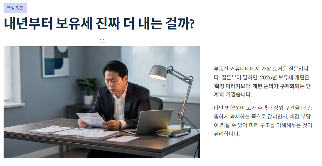 결론부터 말하면, 2026년 보유세 개편은 **‘확정’이라기보다 ‘개편 논의가 구체화되는 단계’**에 가깝습니다. 다만 방향성이 ‘고가 주택/상위 구간을 더 촘촘하게 과세’ 쪽으로 잡히면, 체감 부담이 커질 수 있어 미리 구조를 이해해두는 게 유리해요.
