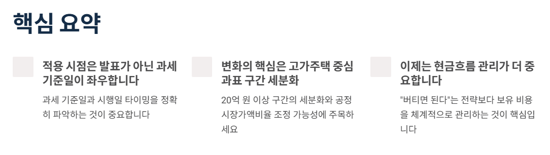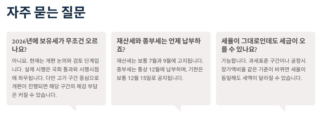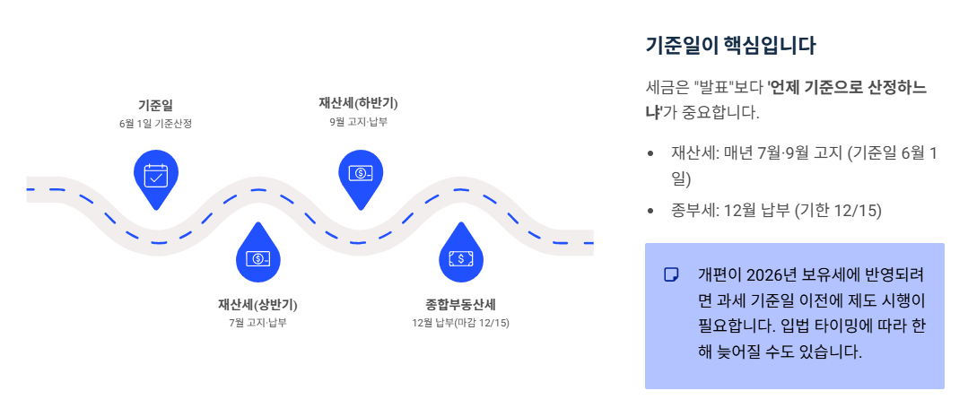 개편이 진짜로 “2026년 보유세”에 반영되려면, 실무적으로는 해당 과세 기준일(예: 6월 1일) 이전에 제도가 시행되어야 하는 경우가 많습니다. 그래서 뉴스에서 “2026년 적용”이란 말이 나오더라도, 실제론 입법/시행 타이밍에 따라 한 해 늦어질 수도 있어요. (이 부분이 매번 혼란 포인트입니다.)