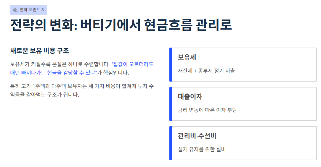 - 이제는 “버티면 된다”보다 보유 비용(현금흐름) 관리가 더 중요해질 수 있습니다.