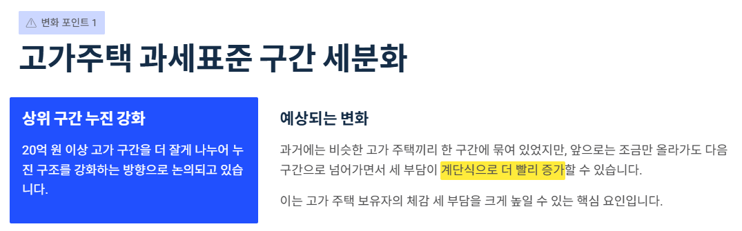 예전엔 “비슷한 고가 주택끼리 한 구간”에 묶여 움직였다면, 앞으로는 조금만 올라가도 다음 구간으로 넘어가면서 세 부담이 계단식으로 더 빨리 증가할 수 있습니다.