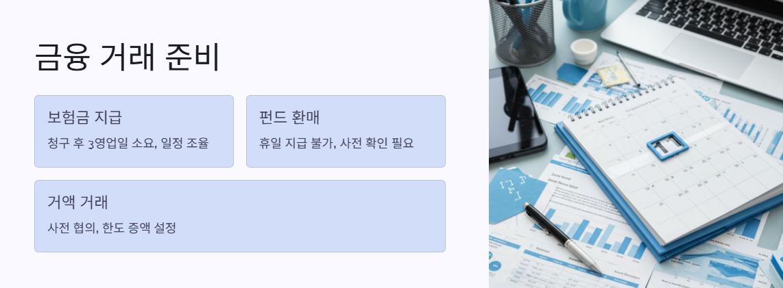 부동산 거래나 법인 간 대규모 자금 결제 등 큰 금액의 거래가 필요한 경우, 은행 휴무로 인해 전자어음, 전자결제수단, 자기앞수표 발행 등이 제한될 수 있습니다. 이를 대비하려면
