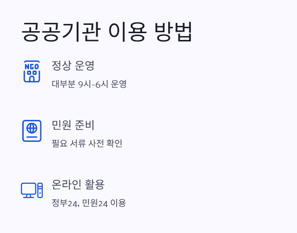 예약제 운영 확인: 일부 공공기관(예: 여권 발급 창구)은 예약제를 운영하니, 방문 전 전화나 웹사이트를 통해 예약 가능 여부를 확인하세요.