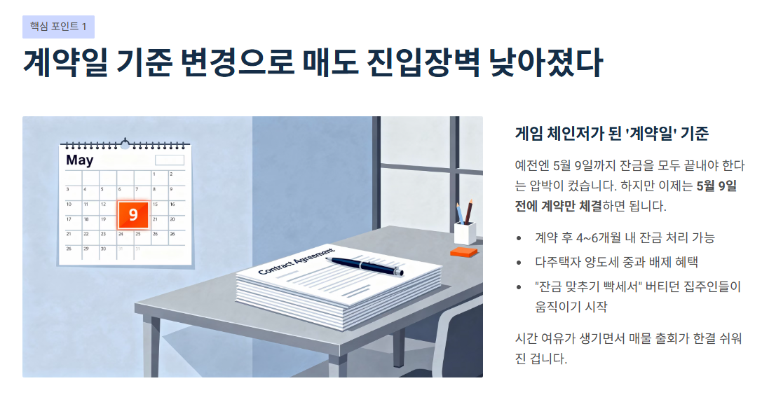 - 이제는 “5월 9일 전에 계약만 안전하게 잡아도” 시간 벌이가 됩니다.