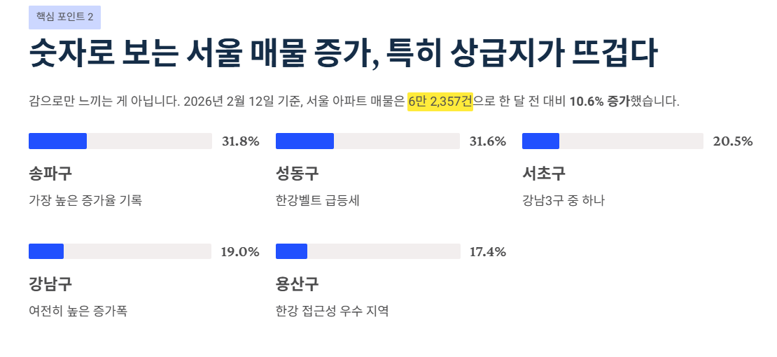 부동산 플랫폼 아실 집계 기준, 2026년 2월 12일 서울 아파트 매물은 6만 2,357건으로 한 달 전 대비 10.6% 증가했어요.
